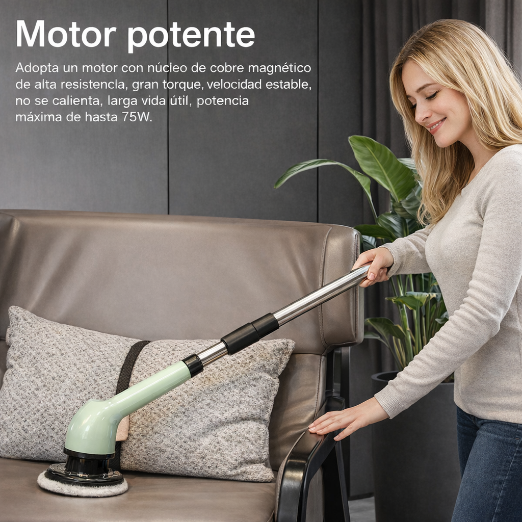 Gracias a su motor eléctrico potente, su diseño extensible y sus 7 cabezales intercambiables, podrás limpiar suelos, juntas, duchas, lavabos y superficies difíciles sin cansarte y sin esfuerzo físico.